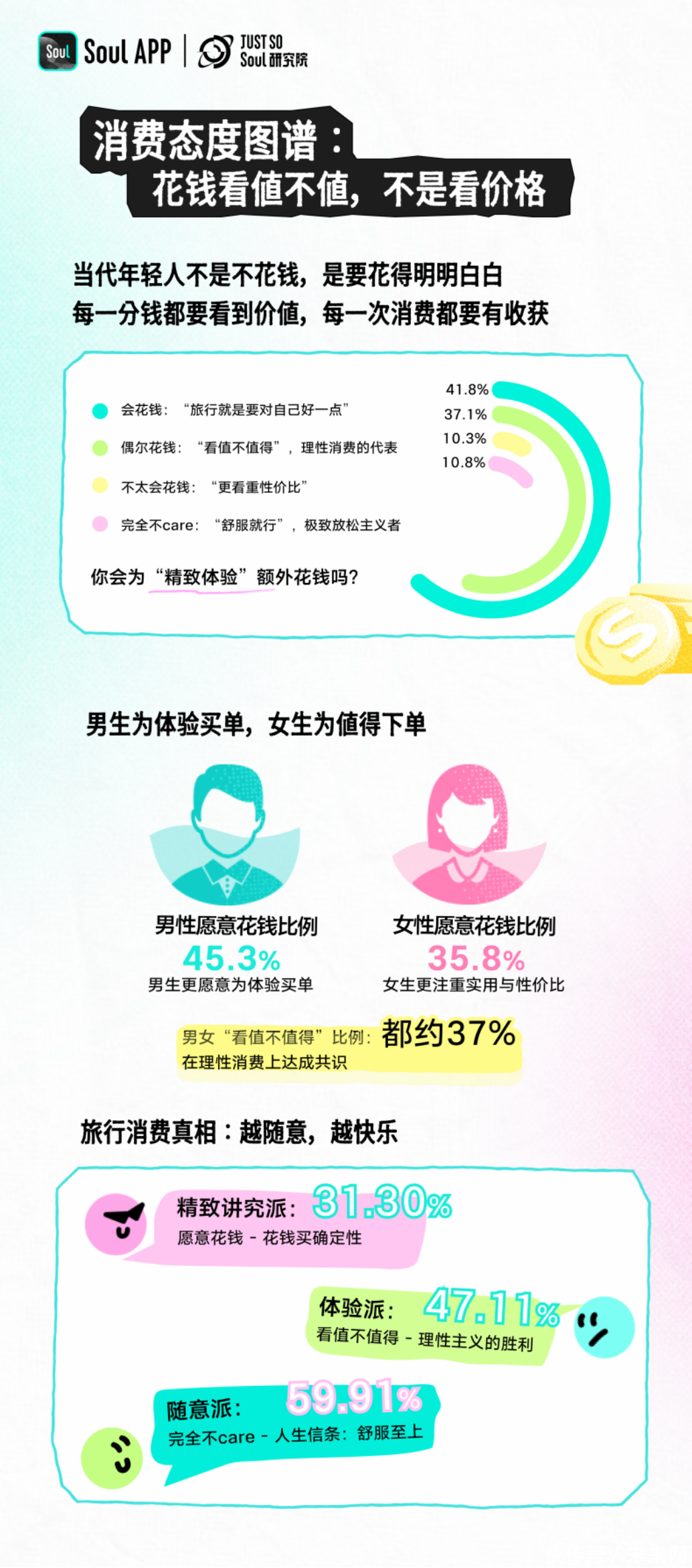 《图鉴》的调研数据揭示了这届年轻旅行者的消费主张:41.8%的受访者表示旅行时愿意花钱,37.1%则看值不值得再行决定——两者合计超过78%的人对旅行消费持积极态度。值得关注的是,性别维度的差异颇为鲜明:男性愿意为精致体验买单的比例高达45.3%,女性为35.8%;但在"看值不值得"这一选项上,男女均约为37%,理性消费的共识跨越了性别边界。